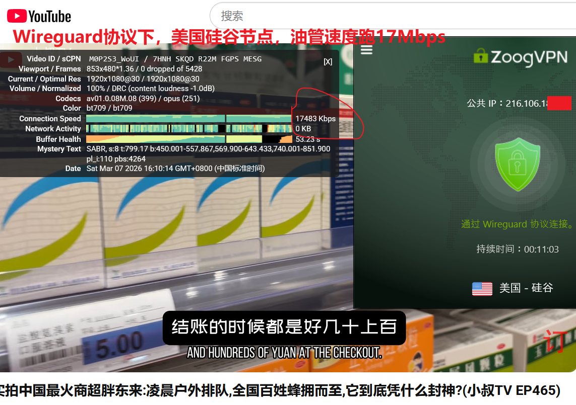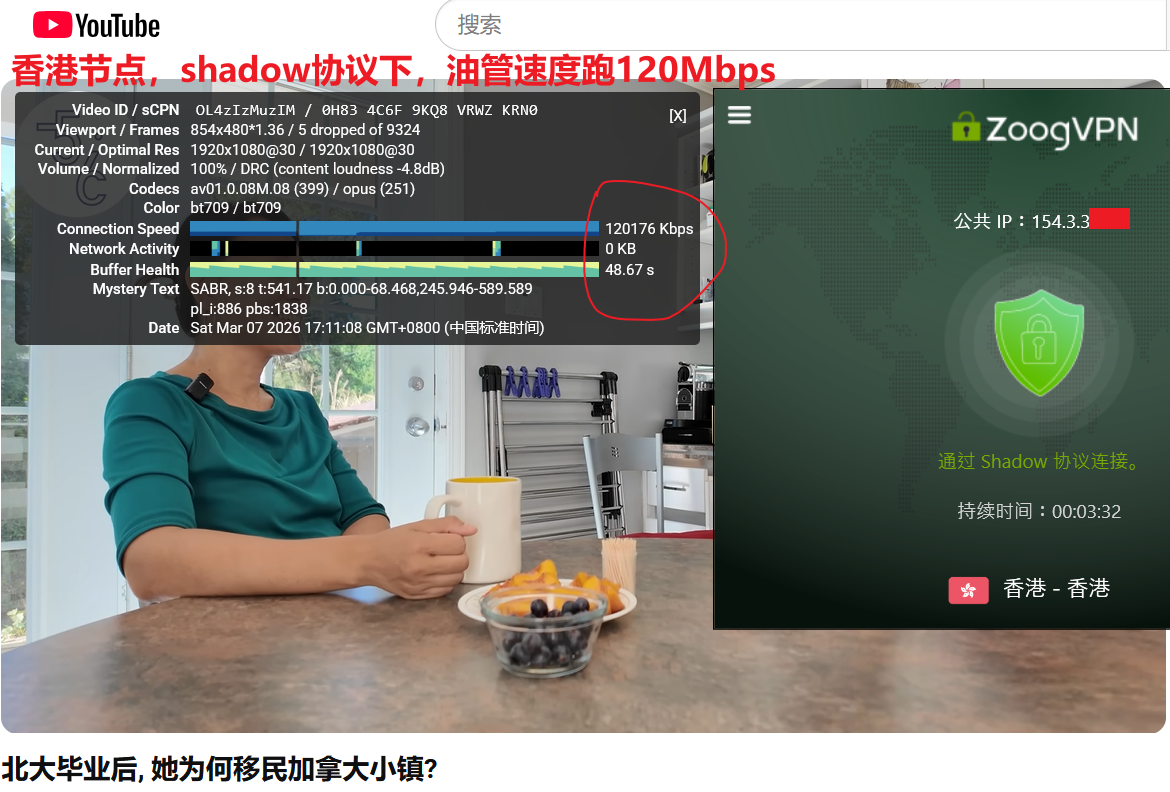 10月7日上午,电信wifi下,先后测试了韩国、香港和阿联酋三个节点,连接协议都是默认的shadow协议,油管速度分别跑55Mbps、82Mbps 、120Mbps,其中香港视频选择的2160P 4K超高清视频,播放非常流畅!而因为新版zoogvpn上,阿联酋ping 值显示的最低,表示网络连通更顺畅,就测试连接了阿联酋节点,油管速度飙升到120Mbps, 非常给力!如下图所示