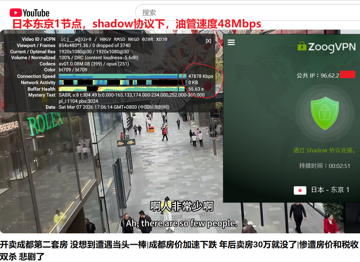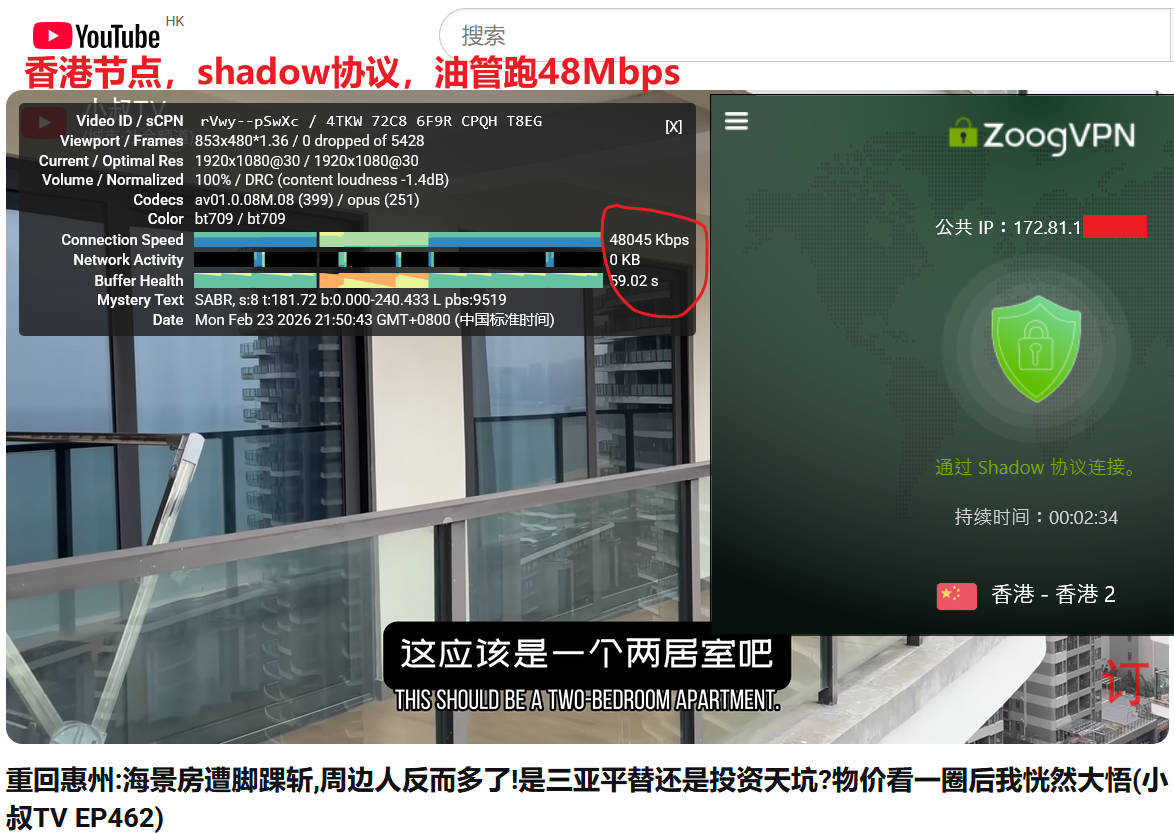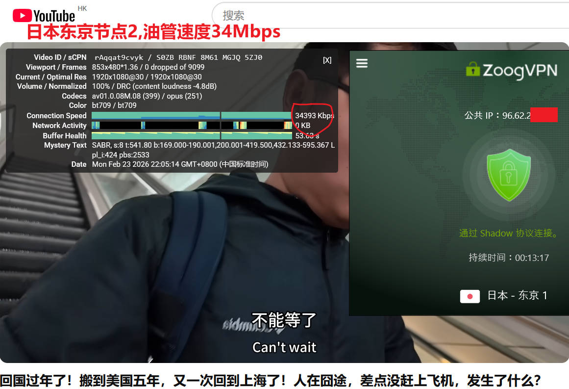 9月7日上午,电信wifi下,先后测试了香港、日本和韩国三个节点,连接协议都是默认的shadow协议,油管速度分别跑64Mbps、76Mbps 、89Mbps(偶尔跑到了105Mbps),其中日本和韩国视频都选择的2160P 4K超高清视频,播放非常流畅!非常给力!如下图所示