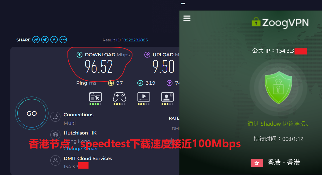 11月2日下午,联通wifi下(隔一个房间,实测带宽就跑100Mbps),先后测试了香港、日本东京、韩国三个节点,连接协议都是默认的shadow协议,使用speedtest测试速度分别为:74Mbps、68Mbps、29Mbps ;测试youtube油管速度分别为96Mbps、65Mbps 、27Mbps, 基本上香港线路非常好,跑到了带宽的满速,日本东京节点线路也还可以,跑到了三分之二满带宽。表现相当优秀!如下图所示