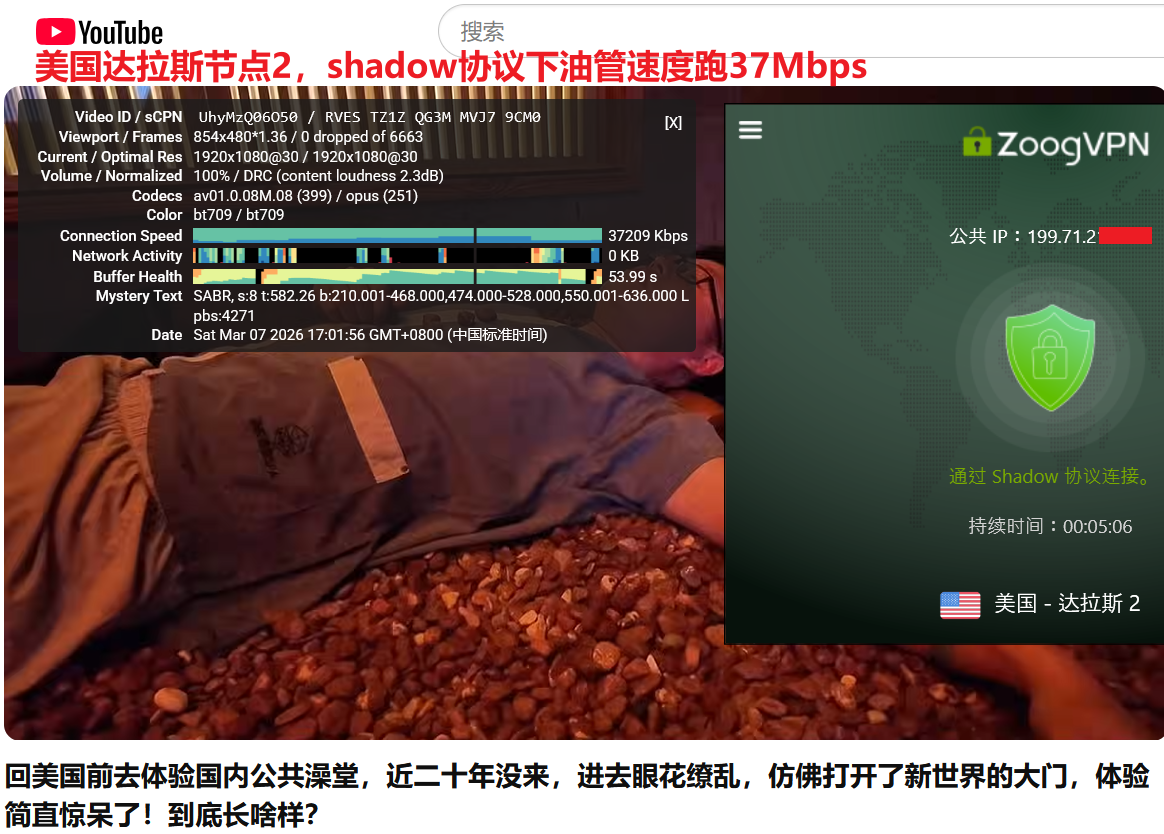 6月2日下午测试完电脑端的,再测试下手机端的。安卓上Zoogvpn app 上随机选择韩国首尔1、美国迈阿密节点,都是10秒内快速连接上,出来的还是shadow 协议,油管速度分别跑43Mbps(测试完退出后发现没截节点连接图,又重新连接截图)、和31Mbps, 速度表现还不错!手机上看油管视频非常丝滑!